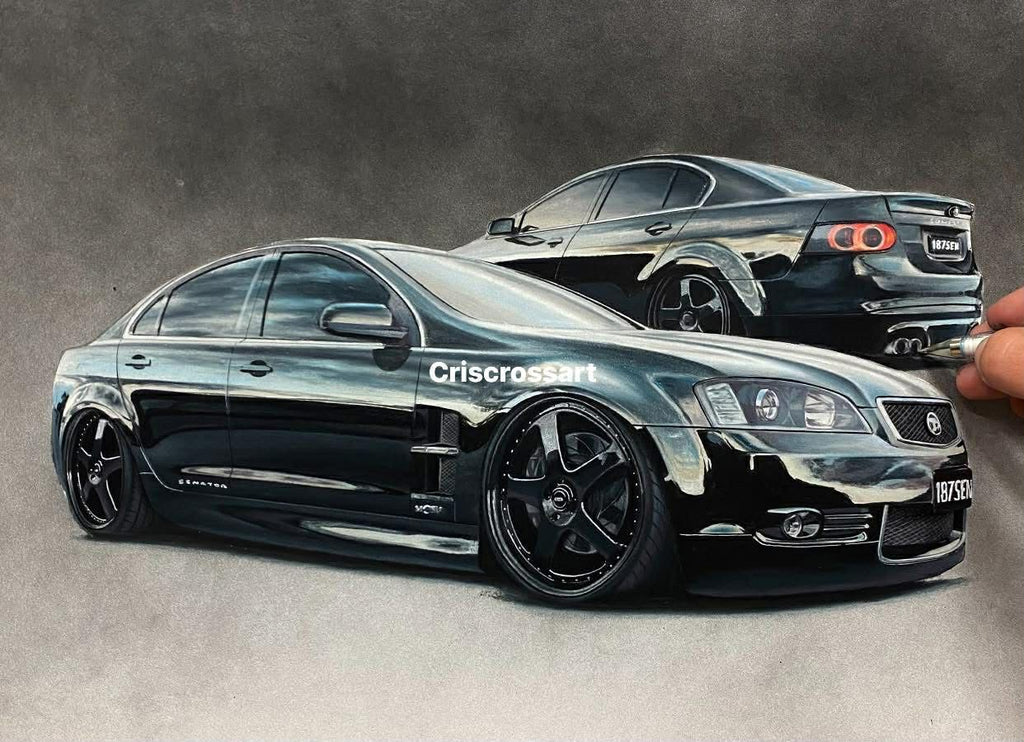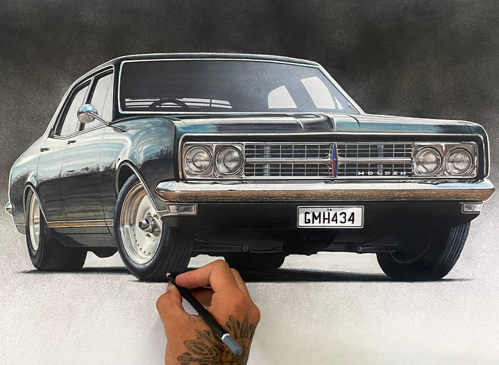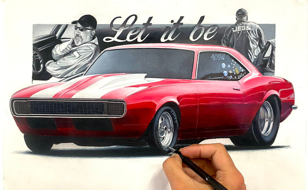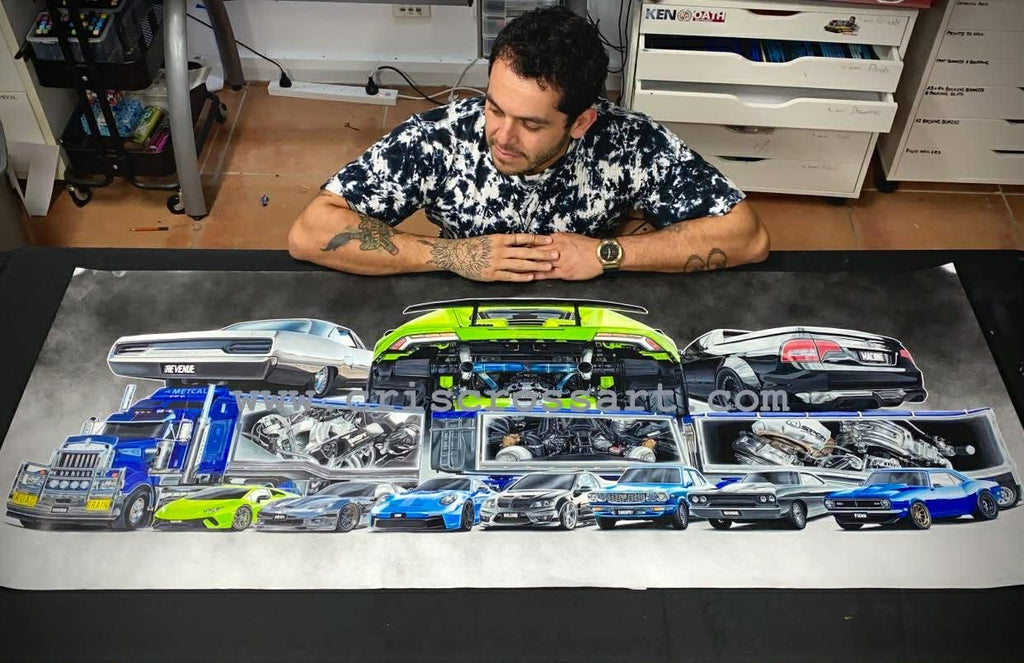 his collection brings together a diverse body of hand-drawn works, including past commissioned pieces, custom client drawings, and personal explorations of automotive form and character.