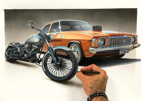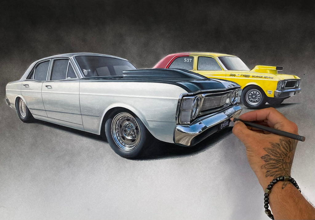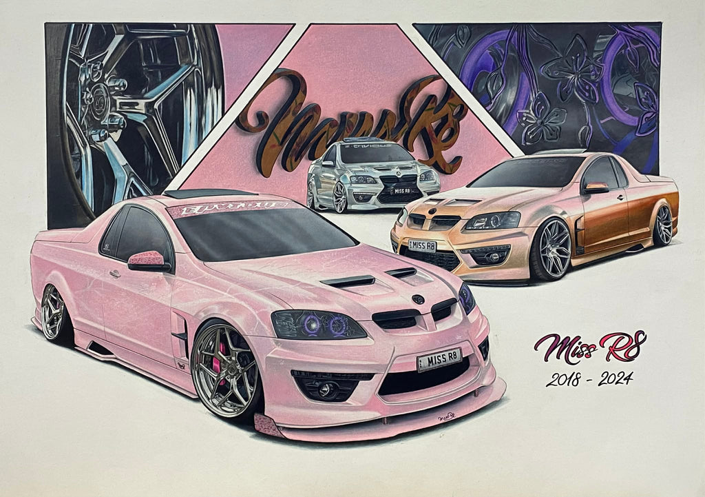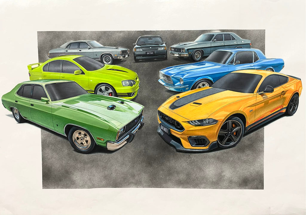 The drawings span a wide range of styles and subjects — from detailed vehicle portraits to more playful, stylised interpretations — showcasing different eras, models, and personalities. Each piece reflects a focus on line, proportion, and character, allowing the vehicle to feel both accurate and expressive.